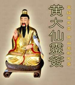 黄大仙俗名黄初平,晋朝丹谿人,年幼家贫,八岁时替人牧羊,十五岁时在山中牧羊遇神仙广成子,后被带至金华赤松山石室洞中学道。从此绝弃尘世追求,潜心修行。积世累功逾四十年,终修得正果,后世称为黄大仙,著名道教神仙。